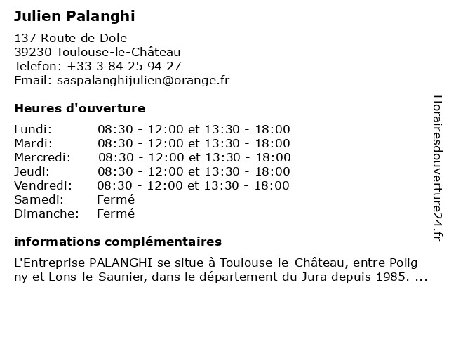 1 Transports Julien SAS (Distance: 11,45 km) Chemin de sous le Moulin, 39140 Bletterans julien, sas, transports 3 Julien Compagnon - Apiculteur (Distance: 14,15 km) 50 Chemin de la Poste, 39570 Pannessières abeilles, apiculteur, compagnon, julien, miels, pannessières 4 Dr Julien Navarro - Médecin Urgentiste (Distance: 16,59 km) 55 Rue du Dr Jean Michel, 39000 Lons-le-Saunier centre, de, dr, hospitalier, julien, jura, le, lons, medecin, médecin, navarro, saunier, site, soins, sud, urgence, urgentiste 5 Julien d'Orcel (Distance: 17,11 km) - Rue des Salines, 39000 Lons-le-Saunier bagues, boucles d'oreilles, bracelets, d'orcel, julien, montres, pendentifs 6 Julien d'Orcel (Distance: 17,47 km) - Avenue Pasteur En Chantrans, 39570 Montmorot accesoires, bijoux, createurs, d'orcel, julien |