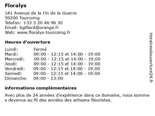 | Samedi | 09:00-12:15 et 14:00-19:00 |