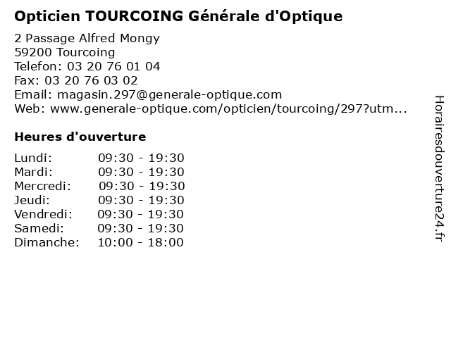 1 Optique Madelaine (Distance: 0,18 km) 25 Rue de Tournai, 59200 Tourcoing lentilles, lunettes, madelaine, optic, opticien, optique, vision, vue 2 Société Générale (Distance: 0,23 km) 33 Grand'place, 59200 Tourcoing association d'épargne et de crédit, atm, conseil en crédit, générale, organisme d'assurance auto, organisme d'assurance moto, organisme d'assurance-habitation, organisme d'assurance-vie, société 3 Opticien Tourcoing | Alain Afflelou (Distance: 0,25 km) 1 Rue Du Général Leclerc, 59200 Tourcoing afflelou, alain, magasin de lunettes de soleil, magasin d’accessoires de mode, opticien, optométrie, tourcoing 4 Opticien Krys (Distance: 0,30 km) 15 Rue Du Général Leclerc, 59200 Tourcoing krys, magasin de lentilles correctrices, magasin de lunettes de soleil, magasin d’accessoires de mode, opticien, optométrie 5 Dr. Pascal Elguiz- Médecine générale (Distance: 1,15 km) 139 Rue de Dunkerque, 59200 Tourcoing consultation, docteur, dr., elguiz, générale, médecine, pascal, santé 6 Dr. Meline Eric- Médecine générale (Distance: 1,51 km) 62 Jules Ferry, 59200 Roubaix consultation, docteur, dr., eric, générale, meline, médecine, santé |