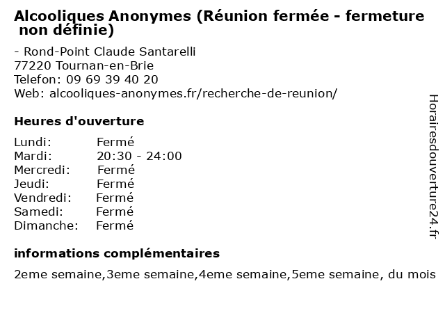 Termes de recherche pour Alcooliques Anonymes (Réunion fermée - fermeture non définie):reunion, non, fermeture, alcooliques, anonymes, définie, fermée |