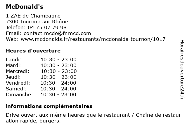 1 McDonald's (Distance: 6,44 km) - Rue du Bois de Gaye, 26600 Pont-de-l'Isère burgers, fast, food, hamburgers, mcdonald's, rapide, restaurant, restauration 2 McDonald's (Distance: 11,52 km) - Zac de la Brassiere, 26240 Saint-Vallier burgers, fast, food, hamburgers, mcdonald's, rapide, restaurant, restauration 3 McDonald's (Distance: 12,75 km) - Les Chabanneries, 26500 Bourg-lès-Valence burgers, fast, food, hamburgers, mcdonald's, rapide, restaurant, restauration 4 McDonald's (Distance: 14,52 km) - Rue Jean Moulin, 07500 Grange-les-Valence commande, drive, en, et, ligne/retrait, mcdonald's, rapide, restaurant, restauration 5 McDonald's (Distance: 14,84 km) - ZAE Le Pas du Buis, 26320 Saint-Marcel-lès-Valence burgers, fast, food, hamburgers, mcdonald's, rapide, restaurant, restauration 6 McDonald's (Distance: 16,01 km) - Avenue Victor Hugo, 26000 Valence burgers, fast, food, hamburgers, mcdonald's, rapide, restaurant, restauration |
