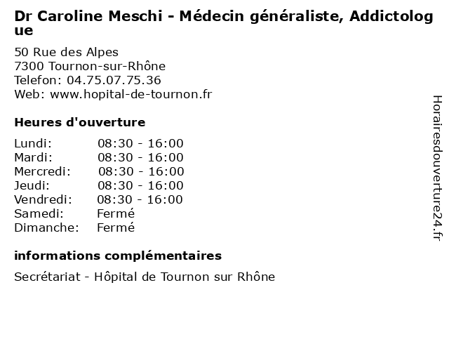 1 Dr Sylvie Bedock - Médecin généraliste, Addictologue (Distance: 0,00 km) 50 Rue des Alpes, 07300 Tournon-sur-Rhône addictologue, bedock, consultation, docteur, dr, généraliste, med, médecin, médecine, sylvie, traitement 2 Caillat Benhamouda Caroline (Distance: 2,22 km) Madame Caroline Benhamouda, 07300 Tournon Sur Rhone benhamouda, caillat, caroline, restaurants 3 Dr Christine Joly - Médecin généraliste Addictologue (Distance: 13,12 km) 607 avenue Geneviève de Gaulle-Anthonioz, 26102 Romans-sur-Isère addictologue, christine, dr, drôme, générale, généraliste, hôpitaux, interne, joly, maladie, médecin, nord 4 Dr Stéphanie Tromp - Médecin généraliste Addictologue (Distance: 13,12 km) 607 avenue Geneviève de Gaulle-Anthonioz, 26102 Romans-sur-Isère addictologue, dr, drôme, générale, généraliste, hôpitaux, interne, maladie, médecin, nord, stéphanie, tromp 5 Dr Caroline Drief - Médecin urgentiste (Distance: 13,57 km) - Rue de l'Hôpital, 26241 Saint-Vallier caroline, dr, drief, drôme, hopital, medecin, médecin, nord, saint, soins, urgence, urgentiste, vallier 6 Caroline Juan - Pédicure-podologue (Distance: 14,09 km) 6 bis rue servan, 26000 Valence caroline, cheville, juan, orteil, pied, podologue, pédicure |
