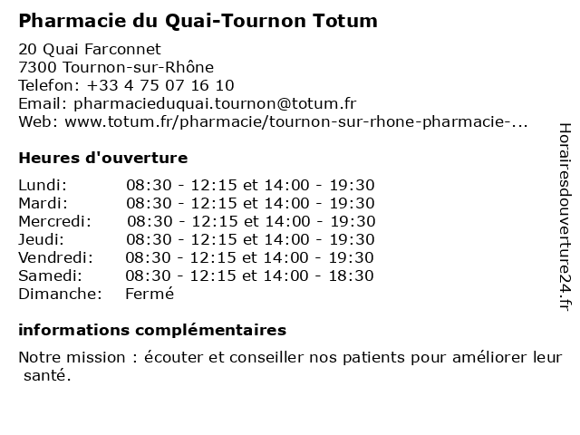 | Mardi | 08:30-12:15 et 14:00-19:30 |