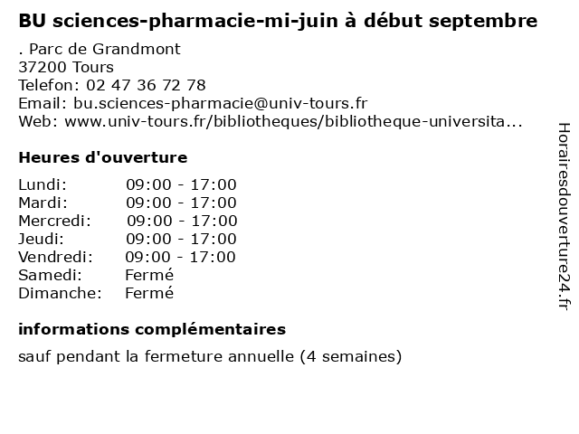 1 Université de Tours - Faculté des Sciences et Techniques (Distance: 0,01 km) - Parc Grandmont, 37200 Tours compus, de, des, et, faculté, sciences, techniques, tours, université, étudiants 2 Bibliothèque Universitaire droit économie géographie - début septembre à mi juin (Distance: 2,14 km) 50 avenue Jean Portalis, 37200 Tours bibliothèque, bu, droit, début, economie et sciences sociales, géographie, juin, mi, septembre, universitaire, économie 3 Bibliothèque Universitaire droit économie géographie - mi juin à début septembre (Distance: 2,14 km) 50 avenue Jean Portalis, 37200 Tours bibliothèque, bu, droit, début, economie et sciences sociales, géographie, juin, mi, septembre, universitaire, économie 4 Square de la Préfecture - 1er juin au 31 août (Distance: 4,52 km) - Boulevard Heurteloup, 37000 Tours 1er, 31, août, arbre, au, de, espace vert, forêt, jardin, juin, la, loisirs, nature, parc, prairie, préfecture, square 5 Square de la Préfecture - 1er mars au 31 mai et du 1er septembre au 31 octobre (Distance: 4,52 km) - Boulevard Heurteloup, 37000 Tours 1er, 31, arbre, au, de, du, espace vert, et, forêt, jardin, la, loisirs, mai, mars, nature, octobre, parc, préfecture, septembre, square 6 BU de médecine:début septembre à mi-juin (Distance: 4,65 km) 10 boulevard Tonnellé, 37032 Tours bibliothèque, bu, de, début, juin, mi, médecine, sciences cliniques, sciences fondamentales, sciences humaines, septembre, universitaire |