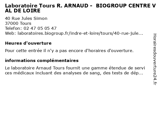 | Appeler Laboratoire Tours R. ARNAUD - BIOGROUP CENTRE VAL DE LOIRE | |