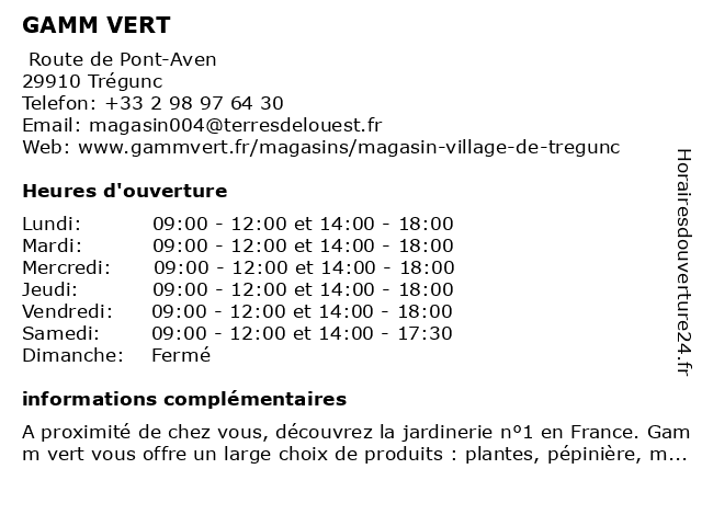 1 GAMM VERT (Distance: 12,31 km) Zone d'aménagement différé de Dioulan, 29140 Rosporden animalerie, gamm, jardin, jardinerie, mobilier de jardin, plantes, pépinière, vert 2 Gamm vert (Distance: 19,50 km) - Za Kergoaler, 29300 Quimperle animalerie, animaux, gamm, horticulteur, jardin, jardinerie, vert 4 Votre Point Vert (Distance: 1,13 km) n/a Beg Postillon, 29910 TREGUNC animals, clothing, flower market, garden, garden tools, interior, pet, point, vert, votre 5 Votre Point Vert (Distance: 8,33 km) 9 rue Jacques Noël Sané, 29900 CONCARNEAU animals, clothing, flower market, garden, garden tools, interior, pet, point, vert, votre 6 Gamm Vert Village (Distance: 11,78 km) Zone Artisanale de Dioulan, 29140 Rosporden gamm, vert, village |