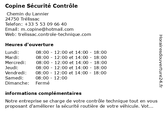 1 AS Auto Sécurité Contrôle technique Trelissac - Perigueux Est (Distance: 0,44 km) 32 Avenue De L`automobile, 24750 TRELISSAC as, auto, contrôle, est, perigueux, sécurité, technique, trelissac 3 Centre contrôle technique DEKRA (Distance: 5,47 km) 8 Boulevard de Stalingrad, 24000 Périgueux 4x4, camping car, centre, collection, contrôle, dekra, diesel, electrique, essence, gazole, hybride, suv, technique, utilitaire, voiture 4 DEKRA PERIGUEUX Contrôle technique (Distance: 5,47 km) 8 Boulevard de Stalingrad, 24000 Périgueux contrôle, dekra, perigueux, technique 5 Compétence Sécurité (Distance: 5,88 km) 7 rue du Lys, 24000 Périgueux alerter, compétence, dissuader, détecter, garder, intervenir, préserver, surveiller, sécurité 6 Direction Départementale de la Sécurité Publique (Distance: 6,14 km) . Rue du 4-Septembre, 24016 Périgueux administration, ddsp, de, direction, dordogne, départementale, la, organismes, publics, publique, services, sécurité |