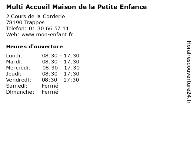 1 Crèche Collective de la Maison de la Petite Enfance (Distance: 0,00 km) 2 Cours de la Corderie, 78190 Trappes caregivers houses, child care, collective, crèche, de, enfance, family home, home care, kindergartens, la, maison, micro-nurseries, parental home, petite 2 La Petite Pause (Distance: 1,25 km) 15 Boulevard Martin Luther King, 78190 Trappes bar, bistro, bistrot, brasserie, café, la, pause, petite, restaurant, restauration 3 Multi Accueil Violeta Parra (Distance: 1,75 km) 17 Allée Claude Debussy, 78190 Trappes accueil, caregivers houses, child care, family home, home care, kindergartens, micro-nurseries, multi, parental home, parra, violeta 4 Multi Accueil L'Archipel (Distance: 2,53 km) 18 Allée des Boutons d'Or, 78180 Montigny-le-Bretonneux accueil, caregivers houses, child care, family home, home care, kindergartens, l'archipel, micro-nurseries, multi, parental home 5 Fitness Park - Accueil (Distance: 2,91 km) 61 ter boulevard Vauban, 78180 Montigny le Bretonneux accueil, club, fitness, horaires, musculation, park, salle, sport 6 Espace petite enfance - Multi-accueil (Distance: 2,92 km) 8 Rue Jean Gabin, 78390 Bois D'Arcy accueil, caregivers houses, child care, enfance, espace, family home, home care, kindergartens, micro-nurseries, multi, parental home, petite |