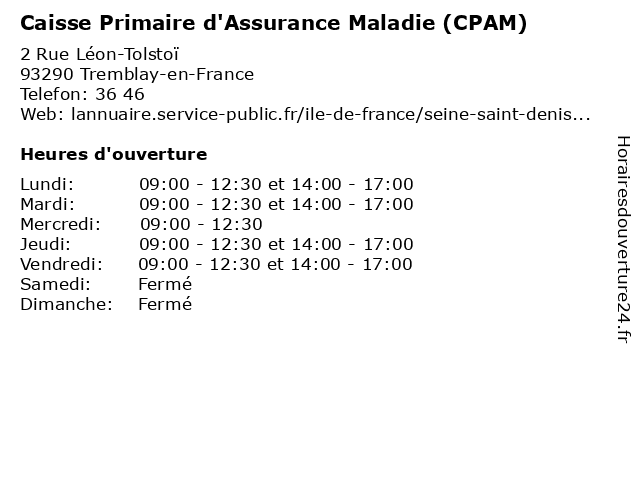 1 Caisse Primaire d'Assurance Maladie (CPAM) (Distance: 2,52 km) . Avenue du Dauphiné, 77290 Mitry-Mory administration, assoc, caisse, cpam, d'assurance, maladie, primaire, services, services publics 2 Caisse Primaire d'Assurance Maladie (CPAM) (Distance: 4,60 km) 4 Rue Modigliani, 93370 Montfermeil administration, assoc, caisse, cpam, d'assurance, maladie, primaire, services, services publics 3 Caisse Primaire d'Assurance Maladie (CPAM) (Distance: 5,68 km) 8 Rue Marcel-Sembat, 93604 Aulnay-sous-Bois administration, assoc, caisse, cpam, d'assurance, maladie, primaire, services, services publics 4 Caisse Primaire d'Assurance Maladie (CPAM) (Distance: 8,17 km) 1 Rue du Révérend-Père-Chaillet, 77500 Chelles administration, assoc, caisse, cpam, d'assurance, maladie, primaire, services, services publics 5 Caisse Primaire d'Assurance Maladie (CPAM) (Distance: 11,81 km) 7 Allée Louis-Aragon, 93160 Noisy-le-Grand administration, assoc, caisse, cpam, d'assurance, maladie, primaire, services, services publics 6 Caisse Primaire d'Assurance Maladie (CPAM) (Distance: 12,03 km) 121 Avenue Paul-Vaillant-Couturier, 93120 La Courneuve administration, assoc, caisse, cpam, d'assurance, maladie, primaire, services, services publics |