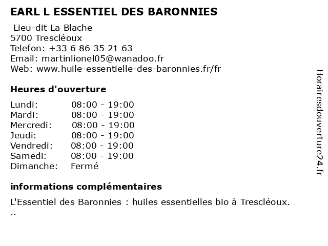 1 Auberge Des Baronnies (Distance: 12,55 km) s/n Quartier la Remise, 05700 L 'Epine auberge, baronnies, cuisine, des, restaurants, restauration 4 Decathlon Essentiel Sisteron (Distance: 18,35 km) Allée des Cèdres, 04200 Sisteron decathlon, essentiel, sisteron 5 Vallon des Lavandes - Distillerie (Distance: 36,90 km) - Chemin des Lavandes, 84390 Sault des, distillerie, huile essentielle, lavandes, sault, vallon 6 Distillerie Bleu Provence (Distance: 47,81 km) 58 promenade de la Digue, 26110 Nyons bleu, distillerie, huile essentielle, la, nyons, provence |