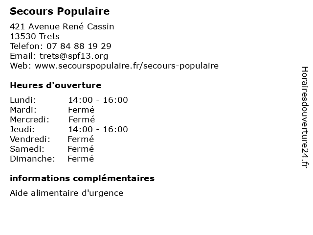 1 Secours Populaire (Distance: 16,99 km) 24 Avenue d'Aix, 13120 Gardanne actions, association, dons, populaire, secours 2 Secours Populaire (Distance: 19,13 km) 374 Avenue Gabriel Péri, 13400 Aubagne actions, association, dons, populaire, secours 3 Secours Populaire (Distance: 19,37 km) - Aire du Portelet, 13780 Cuges-les-Pins actions, association, dons, populaire, secours 4 Centre de secours Trets - SDIS 13 (Distance: 0,92 km) 280 Route de Gardanne, 13530 Trets 13, centre, de, lutte contre les incendies, pompier, protection, prévention, sdis, secours, trets 5 Centre de secours Fuveau - SDIS 13 (Distance: 9,98 km) - Avenue Maréchal Leclerc, 13270 Fuveau 13, centre, de, fuveau, lutte contre les incendies, pompier, protection, prévention, sdis, secours 6 Secours Catholique (Distance: 10,85 km) - Rue de la Verrière, 13850 Gréasque associatif, association, bénévolat, bénévole, catholique, secours, solidaire, solidarité |