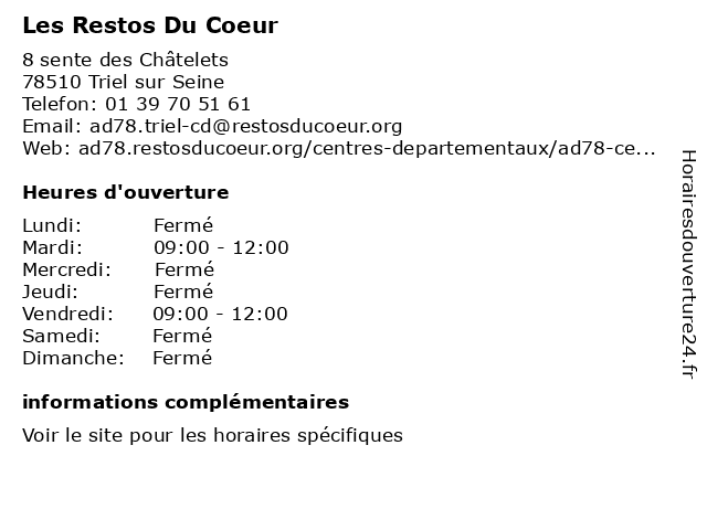 1 Les Restos Du Coeur (Distance: 1,77 km) 85 allée des Résédats, 78540 Vernouillet aides, alimentaire, coeur, du, les, restos, santé, solidarité, soutien 2 Les Restos Du Coeur (Distance: 2,62 km) - Sente des Croix, 78570 Chanteloup-les-Vignes aides, alimentaire, coeur, du, les, restos, santé, solidarité, soutien 3 Les Restos Du Coeur (Distance: 5,04 km) - Rue des Erables, 78780 Maurecourt aides, alimentaire, coeur, du, les, restos, santé, solidarité, soutien 4 Les Restos Du Coeur (Distance: 5,50 km) 13 bis Rue Léonard Laroche, 78700 Conflans-Sainte-Honorine aides, alimentaire, coeur, du, les, restos, santé, solidarité, soutien 5 Les Restos Du Coeur (Distance: 5,50 km) 34 Rue Pasteur, 78300 Poissy aides, alimentaire, coeur, du, les, restos, santé, solidarité, soutien 6 Les Restos Du Coeur (Distance: 6,69 km) 6 Rue Maryse Bastié, 78130 Les Mureaux aides, alimentaire, coeur, du, les, restos, santé, solidarité, soutien |
