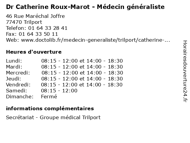 1 Dr Catherine Roux - Médecin généraliste (Distance: 0,01 km) 46 Rue Maréchal Joffre, 77470 Trilport catherine, dr, généraliste, médecin, médecine, médical, pharmaceutique, roux, traitement 2 Catherine Marzanasco - Sage-femme (Distance: 4,33 km) 13 Rue de Fublaines, 77100 Meaux catherine, femme, marzanasco, médecins, médicaments, sage, santé, secrétariat, spécialiste 3 Dr Catherine Guerin - Gynécologue obstétricien (Distance: 4,74 km) 6-8 Rue Saint-Fiacre, 77100 Meaux catherine, dr, guerin, gynécologie, gynécologue, obstétricien, obstétrique 4 Maître Catherine Bahuchet - Avocate (Distance: 5,02 km) 8 quai Sadi Carnot, 77100 Meaux avocate, avocats, bahuchet, catherine, civils, droits, juridiques, maître 5 Dr Galinski Catherine - Médecine générale (Distance: 5,08 km) 24 Place marcel pagnol, 77100 Nanteuil les meaux catherine, docteur, dr, galinski, générale, medecin, médecine, nanteuil les meaux 6 Maître Catherine Aymard - Avocate (Distance: 5,27 km) 1 place de l’Hôtel de Ville, 77100 Meaux avocate, avocats, aymard, catherine, civils, droits, juridiques, maître |