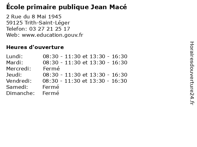 1 École maternelle publique Jean Macé (Distance: 0,00 km) 2 Rue du 8 Mai 1945, 59125 Trith-Saint-Léger cours, education, jean, macé, maternelle, publique, services, école 2 École Primaire Publique Sévigné - Jean Macé (Distance: 9,02 km) 236 Rue Jules Guesde, 59156 Lourches cours, education, jean, macé, primaire, publique, services, sévigné, école 3 École primaire publique Jean Macé (Distance: 23,62 km) 16 Rue Marliot, 59540 Caudry cours, education, jean, macé, primaire, publique, services, école 4 École primaire publique Jean Macé (Distance: 28,62 km) 1 Rue Jean Mace, 59191 Caullery cours, education, jean, macé, primaire, publique, services, école 5 École primaire publique Jean Macé (Distance: 40,30 km) 2 Rue du Général de Gaulle, 59133 Camphin-en-Carembault cours, education, jean, macé, primaire, publique, services, école 6 École primaire publique Jean Macé (Distance: 47,96 km) . Rue Rouget de Lisle, 62580 Vimy cours, jean, macé, primaire, publique, servicios, école |