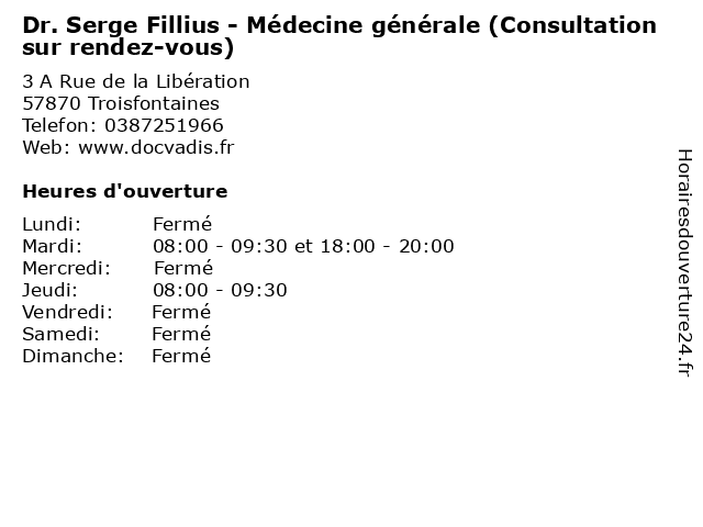 1 Dr. Serge Fillius - Médecine générale (Consultation libre) (Distance: 0,00 km) 3 A Rue de la Libération, 57870 Troisfontaines consultation, docteur, dr., fillius, générale, libre, médecine, santé, serge 2 Dr. Iqbal Hawari - Chirurgie générale et digestive (Consultation libre) (Distance: 8,27 km) 25 avenue du général de gaulle, 57400 Sarrebourg chirurgie, consultation, digestive, docteur, dr., et, générale, hawari, iqbal, libre, santé 4 Dr. Jean-Patrick Henry - Médecine générale (Consultation libre) (Distance: 8,73 km) 12 Avenue poincaré, 57400 Sarrebourg consultation, docteur, dr., générale, henry, jean, libre, médecine, patrick, santé 5 Dr. Francine Burrus Mehl - Psychiatrie (Consultation sur rendez-vous) (Distance: 8,76 km) 16 Rue De La Gare, 57400 Sarrebourg burrus, consultation, docteur, dr., francine, medecins, mehl, psychiatrie, rendez, santé, sur, vous 6 Dr. Serge Huguenel - Rhumatologie (Distance: 8,77 km) 2 Rue des cordeliers, 57400 Sarrebourg consultation, docteur, dr., huguenel, rhumatologie, santé, serge |