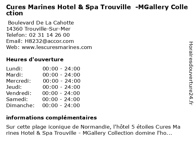 1 Spa Cures Marines by The Purist (Distance: 0,04 km) Boulevard De La Cahotte, 14360 Trouville-Sur-Mer by, cures, marines, purist, spa, the 2 Sa Central Hotel (Distance: 0,30 km) 6 Rue Des Bains, 14360 Trouville Sur Mer central, hotel, restaurants 3 Hotel Résidence La Loggia (Distance: 0,85 km) 64 Rue du Général Leclerc, 14800 Deauville bar, hotel, la, loggia, restaurant, résidence, service 4 Hotel Marie Anne (Distance: 0,88 km) 142 Avenue de la République, 14800 Deauville anne, bar, hotel, marie, restaurant, service 5 81 L'hotel (Distance: 0,96 km) 81 Avenue de la République, 14800 Deauville 81, bar, hotel, l'hotel, restaurant, service 6 Hotel Résidence La Closerie Deauville (Distance: 0,97 km) 156 Avenue de la République, 14800 Saint-Arnoult bar, closerie, deauville, hotel, la, restaurant, résidence, service |