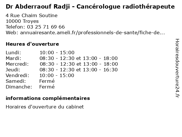 1 Dr Abderraouf Radji - Radiothérapeute (Distance: 0,00 km) 4 Rue Chaim Soutine, 10000 Troyes abderraouf, diagnostique, dr, imagerie, radiologie, radiothérapeute, radji, thérapeutique 2 Dr Corina ciupea - Cancérologue radiothérapeute (Distance: 0,00 km) 4 rue Chaïm Soutine, 10000 Troyes cancérologue, ciupea, consultation, corina, docteur, dr, medecins, oncologie, radiothérapeute, rendez, santé, sur, vous 3 Dr. Jean-Paul Hurdebourcq - Pneumologie (Autre) (Distance: 2,43 km) 17 rue Charles Baltet, 10120 Saint Andre Les Vergers autre, consultation, docteur, dr., hurdebourcq, jean, paul, pneumologie, santé 4 Pharmacie de la Trecey Totum (Distance: 41,98 km) 4 Allee Gerard Magne, 89600 Saint-Florentin de, la, parapharmacie, pharmacie, pharmacie cancer, pharmacie de garde, pharmacie depistages, pharmacie diabète, pharmacie oncologie, pharmacie saint-florentin, pharmacie test angine, pharmacie test covid, pharmacie test cystite, pharmacie test grippe, pharmacie vaccin, pharmacie à saint-florentin, pharmaciens, saint-florentin, totum, trecey 5 Autre Chose (Distance: 58,32 km) 48 Rue de la République, 89100 Sens accessoires, autre, boutique, chose, femme, mode, sens, vêtements |
