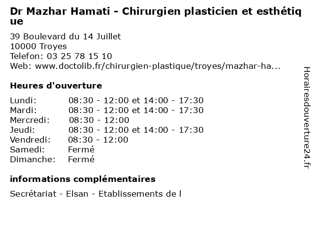 2 Dr Ghada Hamati - Chirurgien-dentiste (Distance: 1,75 km) 101 avenue Anatole France, 10003 Troyes centre, chirurgie, chirurgien, de, dentiste, dr, ghada, hamati, hospitalier, maxillo-faciale, odontologie, stomatologie, troyes 3 Dr Gabriel Hubner - Chirurgien plastique et esthétique (Distance: 2,33 km) 04 rue Chaïm Soutine, 10000 Troyes champagne, chirurgien, chiurgie, clinique, de, dr, esthétique, et, gabriel, general, hubner, plastique, reconstructrice, soins, troyes 4 Passage Bleu Esthétique (Distance: 3,70 km) . Rue des Acacias, 10410 Saint Parres Aux Tertres beaute, bleu, coiffure, coloration, esthétique, esthétique et spa, mode, passage 5 Esthétique Visage à domicile (Distance: 15,15 km) 14 rue Gué Hongre, 10270 Lusigny sur barse domicile, esthétique, visage 6 Dr Ionut Motoc - Chirurgien viscéral et digestif (Distance: 2,30 km) 4 rue Chaïm Soutine, 10000 Troyes champagne, chirurgien, chiurgie, clinique, de, digestif, dr, et, general, généraliste, ionut, motoc, soins, troyes, viscéral |