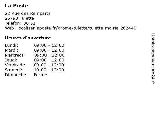 1 La Poste (Distance: 3,22 km) 1 Route buisson, 84290 St roman de malegarde la, la poste, poste, st roman de malegarde 3 La Poste (Distance: 6,00 km) 8 place des Vignerons, 84290 Cairanne agence, assurance, banque, banque postale, bureau de poste, chronopost, colis, courrier, dps, expéditions internationales, la, point, postale, poste, relais, timbres, téléphonie, ups, western union 5 La Poste (Distance: 8,15 km) 13 Passage du Villadei, 84110 Villedieu agence, assurance, banque, banque postale, bureau de poste, chronopost, colis, courrier, dps, expéditions internationales, la, point, postale, poste, relais, timbres, téléphonie, ups, western union 6 La Poste (Distance: 8,23 km) 696 Route des Princes d'Orange, 84110 Roaix agence, assurance, banque, banque postale, bureau de poste, chronopost, colis, courrier, dps, expéditions internationales, la, point, postale, poste, relais, timbres, téléphonie, ups, western union |