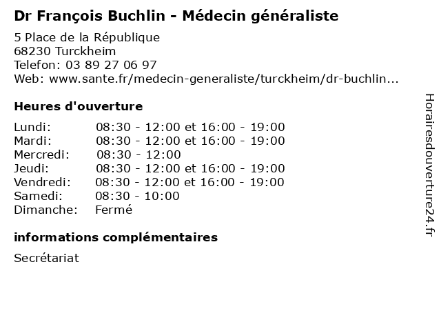 | Jeudi | 08:30-12:00 et 16:00-19:00 |