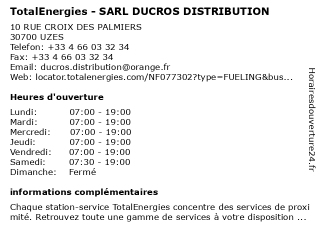 Termes de recherche pour TotalEnergies - SARL DUCROS DISTRIBUTION:sarl, total, distribution, ducros, gas station, station service, tankstelle, totalenergies |
