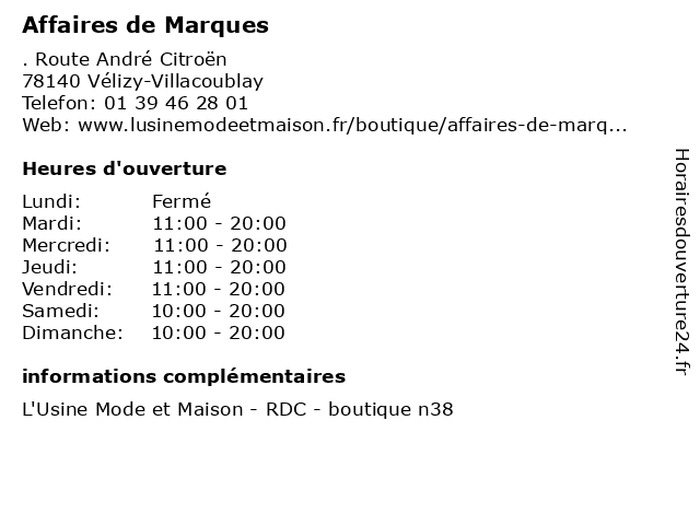 1 Que des Marques (Distance: 0,01 km) . Route Andre Citroen, 78140 Velizy accessories, beaute, cafe, chaussures, des, maison, marques, mode enfants, mode femme, mode homme, que, sport 2 Mairie - Affaires sociales et Solidarités (Distance: 3,94 km) 26 rue du Docteur-Le-Savoureux, 92290 Châtenay-Malabry affaires, et, le logement social, le plan canicule, les aides, mairie, sociales, solidarités 3 Centre d'Affaires en ligne (Distance: 5,95 km) 204 Rond-Point du Pont De Sèvres, 92100 Boulogne-Billancourt centre, d'affaires, en, ligne 4 Centre d'Affaires Baya Axess (Distance: 6,97 km) 67 Avenue André Morizet, 92100 Boulogne-Billancourt axess, baya, centre, centre d’affaires, centres, co working, d'affaires, d’affaires, espaces, locations 5 Hôtel Séjours & Affaires Paris Malakoff (Distance: 7,52 km) 120 Boulevard Gabriel Péri, 92240 Malakoff affaires, cafe, hotel, hôtel, malakoff, paris, restaurant, service, séjours 6 |