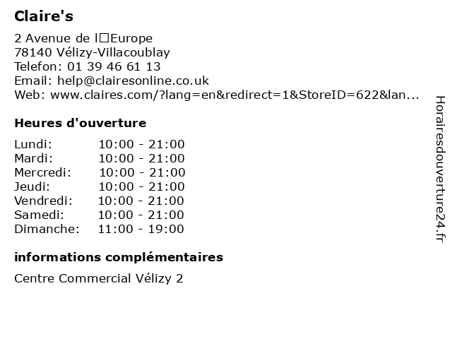 1 Claire's (Distance: 6,24 km) 168 Bd Jean Jaurès, 92100 Boulogne Billancourt accessories, boutique, bracelets, claire's, stores 2 Claire's (Distance: 10,27 km) 22 Rue du Départ, 75015 Paris beaute, cafe, chaussures, claire's, enfants, mode femmes, mode hommes, restaurant, sport 3 Claire's (Distance: 11,48 km) . Rue du Luxembourg, 94320 Thais accessoires, bijoux, cheveux, claire's, décoration, jeux, jouets, mode 4 Claire's (Distance: 12,28 km) 15 Parvis de la Défense, 92092 Paris La Défense chaussures, claire's, lingerie, mode enfant, mode femmes, mode hemmes, sport 5 Claire's (Distance: 12,71 km) 101 Porte Berger, 75045 Paris chaussures, claire's, lingerie, mode enfant, mode femmes, mode hemmes, sport 6 Claire's (Distance: 12,97 km) 5 Place Colbert, 78180 Montigny-le-Bretonneux accessoires, barrettes, bijoux, claire's, fantaisies, mode, vernis |