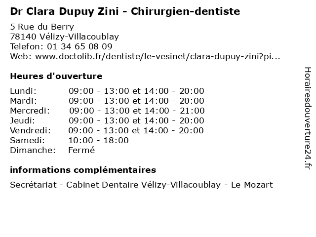 1 Dr Clara Dupuy Zini - Chirurgien-dentiste (Distance: 12,18 km) 20 Bis Rue du Général Clavery, 78110 Le Vésinet chirurgie, chirurgien, clara, dentaire, dentiste, dr, dupuy, zini 2 Dr Clara Dupuy Zini - Chirurgien-dentiste (Distance: 13,79 km) 27 Rue de Pologne, 78100 Saint-Germain-en-Laye chirurgien, clara, dent, dentiste, docteur, dr, dupuy, soins, zini 3 Clara Blanchard - Diététicienne (Distance: 1,56 km) 1 Rue Maryse Bastié, 78140 Vélizy-Villacoublay aliment, blanchard, clara, dieticien, diététicienne, medecin, nutrition 4 Pro Reg'Art - Clara Giorgetti (Distance: 1,69 km) 5 Rue Coste, 78000 Versailles clara, giorgetti, pro, reg'art 5 Clara Tillaut - Infirmière puéricultrice (Distance: 2,72 km) 3 Rue de l'Abbé Rousseaux, 78000 Versailles clara, infirmier, infirmiere, infirmière, puéricultrice, sante, soins, tillaut 6 Dr Clara Bourgade - Cardiologue (Distance: 3,27 km) 9 Chemin des Côtes Montbron, 78350 Les Loges-en-Josas bourgade, cardiologue, clara, coeur, docteur, dr, sante |