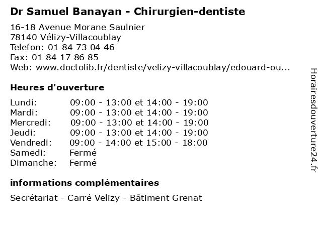 1 Dr Samuel Bounan - Chirurgien-dentiste (Distance: 2,80 km) 40 Rue de la République, 92190 Meudon bounan, chirurgien, dentaire, dentiste, dr, implantologie, parodontologie, samuel 2 Samuel Langlet - Psychomotricien (Distance: 3,44 km) 87 Rue des Bruyères, 92310 Sèvres langlet, medecin, psycho, psychomotricien, psychomotricienne, samuel, sante 3 Dr Samuel Lame - Radiologue (Distance: 4,71 km) 10 Avenue de la Gare, 92330 Sceaux consultation, docteur, dr, lame, med, médecin, radiologue, samuel, traitement 4 Sacha Et Samuel (Distance: 5,52 km) 45 Rue Houdan, 92330 Sceaux accessoires, divers, habillement, magasins, sacha, samuel 5 Dr. Samuel Jaoui - Médecine générale (Distance: 5,69 km) 79 Rue de Bellevue, 92100 Boulogne consultation, docteur, dr., générale, jaoui, médecine, samuel, santé 6 Mon Chasseur Immo - Samuel B. (Distance: 8,20 km) 8 Rue de l'Orme Sec, 94240 L'Haÿ-les-Roses b., chasseur, immo, mon, samuel |