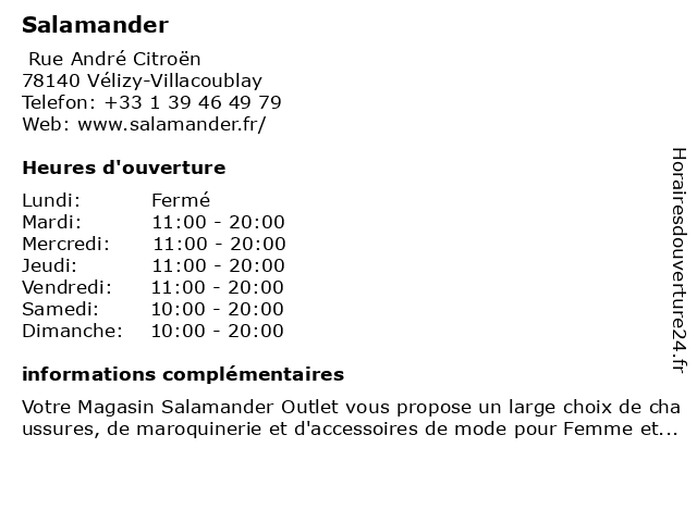 1 Salamander (Distance: 7,13 km) 125, Avenue Jean Jaurès, 92100 Boulogne Billancourt ballerinas, boots, casual shoes, footwear, leather goods and accessories, moccasins, salamander 4 Salamander (Distance: 11,82 km) 53, Bld Saint Michel, 75005 Paris ballerinas, boots, casual shoes, footwear, leather goods and accessories, moccasins, salamander 6 |
