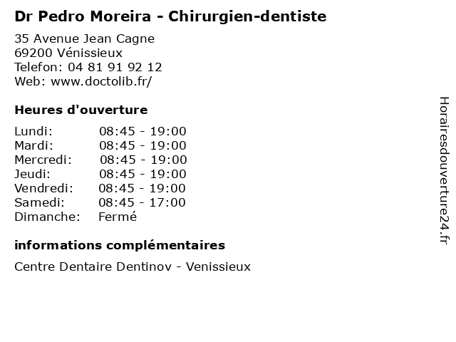 1 Dr Tiago Moreira - Chirurgien-dentiste (Distance: 0,00 km) 35 Avenue Jean Cagne, 69200 Vénissieux chirurgien, dentiste, dr, moreira, médecin, médecine, médical, pharmaceutique, tiago, traitement 2 Oliveira Alves Joao Pedro (Distance: 4,78 km) 39 Rue Thomas Blanchet, 69008 Lyon alves, joao, oliveira, pedro, restaurants 3 Dr Delphine Moreira - Chirurgien-dentiste (Distance: 6,84 km) 51 Rue Léon Jouhaux, 69003 Lyon chirurgien, delphine, dentaire, dentiste, dr, implantologie, moreira, parodontologie 4 Maître Pedro Andujar - Avocat (Distance: 7,35 km) 82 Bis Rue de la Part-Dieu, 69003 Lyon andujar, avocat, justice, loi, maitre, maître, pedro 5 Maître Pedro Andujar Camacho - Avocat (Distance: 7,35 km) 82 Bis rue de la Part-Dieu, 69003 Lyon andujar, avocat, avocats, cabinet, camacho, conseils, contentieux, juridique, justice, litiges, maître, pedro, services 6 Joao Pedro Saganha - Masseur-kinésithérapeute (Distance: 25,39 km) - Rue de la République, 69650 Quincieux docteur, joao, kine, kinesitherapeute, kinésithérapeute, masseur, pedro, saganha |