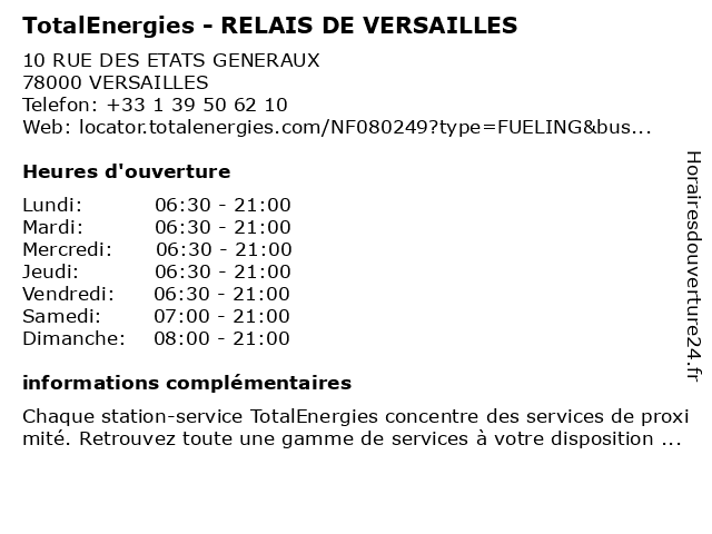 Termes de recherche pour TotalEnergies - RELAIS DE VERSAILLES:relais, de, total, versailles, gas station, station service, tankstelle, totalenergies |