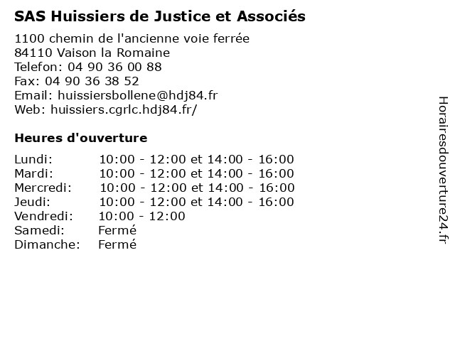 1 SAS Huissiers de Justice et Associés (Distance: 15,04 km) 7 Avenue Henri Rochier, 26110 Nyons associés, cabinet, de, et, huissier, huissiers, justice, s.a.s, s.a.s huissiers de justice et associés, sas 2 Gallo & Associés - Marchand Capron (Distance: 2,23 km) 68 avenue Jules Ferry, 84110 Vaison La Romaine associés, capron, comptabilité, fiscalité, gallo, marchand, vaison la romaine 3 Accord Immobilier Provence SAS (Distance: 2,71 km) 44 Cours Taulignan, 84110 Vaison-la-Romaine accord, immobilier, provence, sas 5 Citroën Giai Jacquis sas (Horaires Généraux) (Distance: 14,60 km) - Route d'Orange, 84600 Valreas citroën, generaux, giai, généraux, horaires, jacquis, sas, services, véhicules 6 Citroën Giai Jacquis sas (Après vente) (Distance: 14,60 km) - Route d'Orange, 84600 Valreas apres, après, citroën, giai, jacquis, sas, services, vente, véhicules |