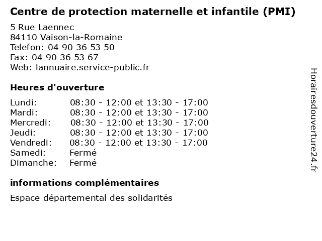 1 Centre de protection maternelle et infantile (PMI) (Distance: 14,45 km) 3 Place Roumanille, 26110 Nyons centre, conseils, de, et, infantile, maternelle, parents, pmi, protection, prévention, puéricultrice, pédiatre 2 Centre de protection maternelle et infantile (PMI) (Distance: 16,09 km) 16 Boulevard Henri-Barbusse, 26170 Buis-les-Baronnies centre, conseils, de, et, infantile, maternelle, parents, pmi, protection, prévention, puéricultrice, pédiatre 3 Centre de Protection Maternelle et Infantile (PMI) (Distance: 17,73 km) - Avenue de Verdun, 84600 Valréas bébé, centre, de, et, infantile, maternelle, parents, pmi, protection, puéricultrice, pédiatre, vaccins 4 L.P.I Protection Incendie (Distance: 18,12 km) 126 Chemin Jean Moulin, 84850 Camaret-sur-Aigues incendie, l.p.i, protection 5 Centre de Vaccination COVID-19 - Mairie (Distance: 0,16 km) 18 Grand' Rue, 84110 Vaison-la-Romaine 19, centre, covid, covid 19, covid19, de, mairie, médecin, médecine, médical, test, vaccin, vaccination, vaccins 6 Centre de Vaccination COVID-19 - Nouvelle Maison de Pays (Distance: 13,78 km) 130 Promenade de la Digue, 26110 Nyons 19, centre, covid, covid 19, covid19, de, maison, médecin, médecine, médical, nouvelle, pays, test, vaccin, vaccination, vaccins |