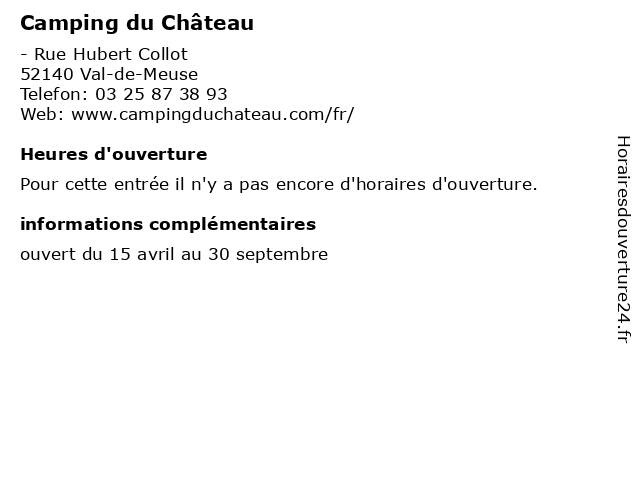 1 Aire Park Réservation - Aire de services pour Camping-cars (Distance: 3,04 km) n/a Aire Val de Meuse, 52140 Val de Meuse aire, arrêt, camping, camping car, cars, de, park, pour, repos, réservation, services, trajet, transports 2 Camping Hautoreille - Accueil des Campeurs (Distance: 14,14 km) 6 rue du Boutonnier, 52360 Bannes accueil, campeurs, camping, des, hautoreille, loisirs, tourisme, vacances 3 Le Camping de la Liez - Réception Haute Saison (Distance: 16,83 km) - Rue des Voiliers, 52200 Peigney camping, caravaning, de, haute, la, le, liez, mobil home, réception, saison, séjour, tourisme, vacances 4 Camping Montmorency (Distance: 18,72 km) Rue Maitre Albert, 52400 Bourbonne-les-Bains camping, montmorency 5 Musée départemental Albert et Félicie Demard Château de Champlitte - 1er avril-30 septembre (Distance: 42,88 km) 7 Rue de l'Église, 70600 Champlitte 1er, 30, albert, ancien, art, avril, champlitte, chateau, château, de, demard, départemental, et, félicie, musee, musée, septembre 6 Musée départemental Albert et Félicie Demard Château de Champlitte - 1er octobre-mi-novembre (Distance: 42,88 km) 7 Rue de l'Église, 70600 Champlitte 1er, albert, ancien, art, champlitte, chateau, château, de, demard, départemental, et, félicie, mi, musee, musée, novembre, octobre |