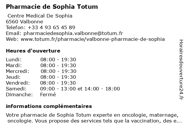 1 Eurofins - Laboratoire d'analyses médicales Valbonne Sophia (Distance: 0,00 km) 1755 Route des Dolines, 06560 Valbonne d'analyses, eurofins, laboratoire, médicales, sophia, valbonne 2 Médiathèque de Valbonne Sophia Antipolis (Distance: 0,02 km) 1855 Route des Dolines, 06560 Valbonne antipolis, bibliothèque, de, livre, médiathèque, services, sophia, valbonne 3 Centre Des Impôts -Sophia Antipolis Impôts (Distance: 1,26 km) 80 Route Des Lucioles, 06560 Valbonne antipolis, centre, des, impôts, publics, services, sophia 4 B&B Hotel Antibes Sophia Antipolis (Distance: 1,33 km) 3550 Route des Dolines, 06410 Biot antibes, antipolis, b&b, bar, cafe, hotel, restaurant, service, sophia 5 B&B Hotel Antibes Sophia Le Relais (Distance: 1,33 km) 3725 Route des Dolines, 06410 Biot antibes, b&b, bar, cafe, hotel, le, relais, restaurant, service, sophia 6 Pharmacie du Chambertin Totum (Distance: 6,33 km) 20 Avenue Maurice Jeanpierre, 06110 Le Cannet chambertin, du, pharmacie, totum |
