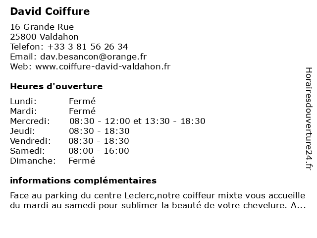 | Mercredi | 08:30-12:00 et 13:30-18:30 |