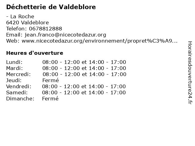 1 Déchèterie (Eté) (Distance: 0,00 km) - La Roche, 06420 Valdeblore débarras, déchets, déchèterie, eté, mai, octobre, poubelles 2 Déchèterie (Distance: 18,29 km) - Quartier Trérious, 06420 Isola débarras, déchets, déchèterie, poubelles 3 Déchèterie (Distance: 22,42 km) 877 Route de Duranus, 06670 Levens débarras, déchets, déchèterie, poubelles 4 Déchèterie (Distance: 32,06 km) n/c Chemin des Négociants Sardes, 06510 Carros débarras, déchets, déchèterie, poubelles 5 Déchèterie (Distance: 32,22 km) - Chemin du Linguador, 06670 Castagniers débarras, déchets, déchèterie, poubelles 6 Déchèterie (Distance: 38,11 km) - boulevard Fuon Santa, 06340 La Trinité débarras, déchets, déchèterie, poubelles |