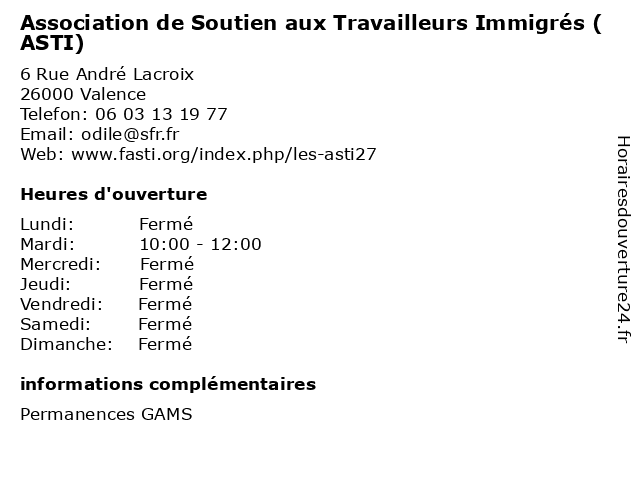 1 Association de Soutien aux Travailleurs Immigrés (ASTI) (Distance: 0,16 km) 2 Rue des Étables, 26000 Valence association, asti, aux, de, droit, immigrés, soutien, travailleurs 2 Association de Soutien aux Travailleurs Immigrés (ASTI) (Distance: 17,59 km) - Place du Chapitre, 26100 Romans-sur-Isère association, asti, aux, de, droit, immigrés, soutien, travailleurs 3 Association des Accidentés de la Vie - FNATH (Distance: 0,18 km) 7 Square de la Visitation, 26000 Valence accidents, accidentés, ardèche, association, de, des, drôme, fnath, groupement, la, vie 4 Bureau d'aide aux victimes - Tribunal de Grande Instance (Distance: 0,38 km) s/n place du palais de justice, 26021 Valence administration, aux, bureau, d'aide, de, du, grande, instance, organismes, publics, services, tribunal, valence, victimes 5 Aux Délices de Lulu (Distance: 0,54 km) . Route de Romans, 26000 Valence aux, beaute, cafe, chaussures, de, délices, enfants, lingerie, lulu, mode femmes, mode hommes, restaurant, sport 6 Multi accueil Aux p'tits mômes (Distance: 1,30 km) 9 Avenue Tony Garnier, 26500 Bourg-lès-Valence accueil, aux, caregivers houses, child care, family home, home care, kindergartens, micro-nurseries, multi, mômes, p'tits, parental home |