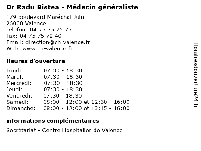 1 Dr Maria-Magdalena Bistea - Médecin généraliste (Distance: 0,00 km) 179 boulevard Maréchal Juin, 26000 Valence bistea, consultation, docteur, dr, généraliste, magdalena, maria, med, médecin, traitement 2 Dr Flore Mouriaux - Médecin généraliste (Distance: 0,83 km) 12 Chemin du Thon, 26000 Valence consultations, docteur, dr, flore, généraliste, mouriaux, médecin, médical 3 Dr Nicolas Stephan - Médecin généraliste (Distance: 23,80 km) 23 Avenue Commandant Corlu, 26260 Saint-Donat-sur-l'Herbasse dr, généraliste, médecin, médecine, médical, nicolas, pharmaceutique, stephan, traitement 4 Adecco Généraliste (Distance: 31,22 km) 9 Rue Albert Chambouleyron, 07000 Privas adecco, agences, cdd, cdi, emploi, emploi intérim, généraliste, services 5 Dr Elise Gerard - Médecin généraliste (Distance: 35,44 km) - Chemin des Boeufs, 26740 Saint-Marcel-lès-Sauzet dr, elise, gerard, généraliste, médecin, médecine, médical, pharmaceutique, traitement 6 Adecco Généraliste (Distance: 40,88 km) - Zac Des Portes De Provence, 26200 Montélimar adecco, agences, cdd, cdi, emploi, emploi intérim, généraliste, services |