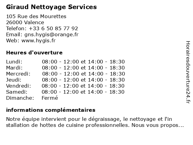 | Samedi | 08:00-12:00 et 14:00-18:30 |