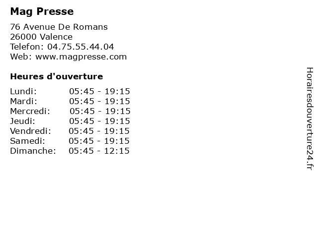 1 Mag Presse (Distance: 1,64 km) 2 Avenue Jean Moulin, 26500 Bourg les Valence mag, magazine, presse, services 4 Mag Presse (Distance: 3,13 km) 1449 Avenue De La Republique, 07500 Guilherand mag, magazine, presse, services 5 Mag Presse (Distance: 16,78 km) 9 Cote Des Cordeliers, 26100 Romans-sur-Isère mag, magazine, presse, services 6 Tabac presse (Distance: 0,56 km) . Route de Romans, 26000 Valence beaute, cafe, chaussures, enfants, lingerie, mode femmes, mode hommes, presse, restaurant, sport, tabac |