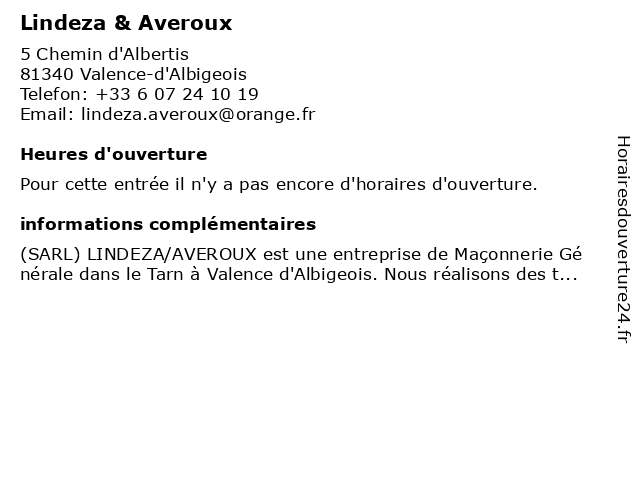 (SARL) LINDEZA/AVEROUX est une entreprise de Maçonnerie Générale dans le Tarn à Valence d'Albigeois. Nous réalisons des travaux de couverture, carrelage, façade, mur de pierres, etc. . . pour...