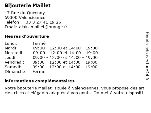 2 Emotion - Bijouterie Maroquinerie (Distance: 0,34 km) 24 Rue de Famars, 59300 Valenciennes bijouterie, bijoux, créations, emotion, horlogerie, maroquinerie 3 Magie d'Or Bijouterie (Distance: 5,96 km) - Route Nationale 45, 59494 Petite-Forêt bijouterie, bijoux, d'or, horlogerie, magie, montre 5 Dr Denis Maillet , Anesthesiste (Distance: 44,69 km) 126 Rue de la Louvière, 59800 Lillle anesthesiste, consultation, denis, docteur, dr, maillet, med, médecin, traitement 6 Richard Maillet - Ostéopathe (Distance: 45,04 km) 51 Boulevard Carnot, 59800 Lille actes et symptômes, expertises, maillet, ostéopathe, ostéopathie pédiatrique, ostéopathie viscérale, richard |