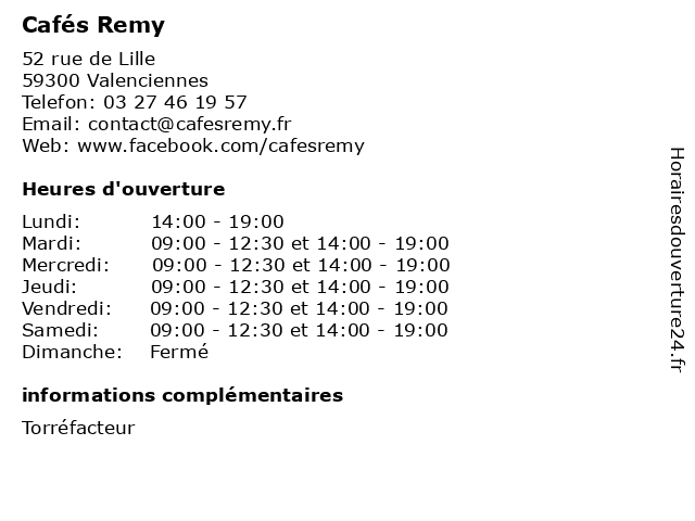 1 Dr David Remy - Chirurgien-dentiste (Distance: 0,57 km) 31 Boulevard Pater, 59300 Valenciennes chirurgien, david, dentaire, dentiste, dentisterie, dr, esthétique, medical, remy, secretariat 2 Remy Distribution (Distance: 1,34 km) 74 rue Jean Jaures, 59410 Anzin climatisation, distribution, remy, électicité 3 Dr Emilie Remy - Médecin généraliste (Distance: 2,15 km) 10 Rue Jean Mermoz, 59770 Marly docteur, dr, emilie, generaliste, généraliste, medical, médecin, remy, soin 4 Cafés et Torréfaction Pikaro (Distance: 4,76 km) 150 rue Henri Maurice, 59494 Aubry du Hainaut accessoires, cafés, d'origines, dégustation, et, gamme de thé, pikaro, torréfaction 5 Quatre Senses (Distance: 0,21 km) 3 Rue de la Paix, 59300 Valenciennes chocolats, donuts, fastfood, quatre, restaurant, senses 6 Columbus Café & Co (Distance: 0,23 km) 55 places d'Armes, 59300 Valenciennes bar, boissons, café, cafés, chaudes, chocolat, co, coffee-shop, columbus, expressos, muffins, restaurant, restauration, sandwichs, thé |