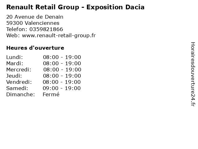 1 Renault Retail Group - Exposition Dacia (Distance: 11,55 km) 76 Rue Louis Leblanc, 59230 Saint-Amand Les Eaux automobiles, dacia, exposition, garage, group, motos-concessionnaire, renault, retail 2 Renault Retail Group (Renault Minute Carrosserie) (Distance: 0,00 km) 20 Avenue de Denain, 59300 Valenciennes automobiles, carrosserie, garage, group, minute, motos-concessionnaire, renault, retail 3 Renault Retail Group (Renault Accessoires) (Distance: 0,00 km) 20 Avenue de Denain, 59300 Valenciennes accessoires, automobiles, garage, group, motos-concessionnaire, renault, retail 4 Renault Retail Group (Véhicule d'Occasion) (Distance: 0,00 km) 20 Avenue de Denain, 59300 Valenciennes automobiles, d'occasion, garage, group, motos-concessionnaire, renault, retail, véhicule 5 Renault Retail Group (Z.E Véhicule Electrique) (Distance: 0,00 km) 20 Avenue de Denain, 59300 Valenciennes automobiles, electrique, garage, group, motos-concessionnaire, renault, retail, véhicule, z.e 6 Renault Retail Group (Distance: 0,00 km) 20 Avenue de Denain, 59300 Valenciennes accessoires, automobiles, garage, group, motos-concessionnaire, renault, retail |