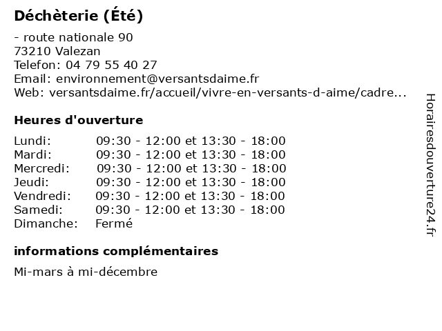 1 Déchèterie (Été) (Distance: 8,87 km) - lieu-dit Les Envers, 73700 Montvalezan bennes, collecte, déchets, déchèterie, détritus, gravats, tri, été 2 Déchèterie (Été) (Distance: 17,67 km) - Champ-Monard, 73270 Beaufort bennes, collecte, déchets, déchèterie, détritus, gravats, tri, été 3 Déchèterie (Été) (Distance: 19,06 km) - Route départementale 902, 73320 Tignes bennes, collecte, déchets, déchèterie, détritus, gravats, tri, été 4 Déchèterie (Hiver) (Distance: 0,00 km) - route nationale 90, 73210 Valezan bennes, collecte, déchets, déchèterie, détritus, gravats, hiver, tri 5 Sherpa (été ) (Distance: 3,10 km) - Les Villards, 73700 Arc 1800 fondue ou pierre à griller, la commande en ligne, le prêt d’appareils à raclette, marche, sherpa, supermarche, été 6 Déchèterie (Distance: 3,19 km) n/c route de la Croisette, 73700 Bourg-Saint-Maurice bennes, collecte, déchets, déchèterie, détritus, gravats, tri |