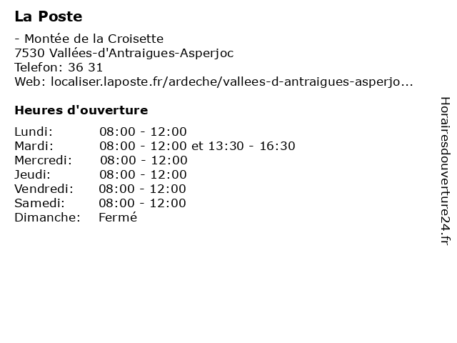 1 La Poste (Distance: 4,37 km) - Place de l'Eglise, 07600 Labastide-sur-Bésorgues agence, assurance, banque, banque postale, bureau de poste, chronopost, colis, courrier, dps, expéditions internationales, la, point, postale, poste, relais, timbres, téléphonie, ups, western union 2 La Poste (Distance: 6,90 km) - Pont de Veyrières, 07380 Chirols agence, assurance, banque, banque postale, bureau de poste, chronopost, colis, courrier, dps, expéditions internationales, la, point, postale, poste, relais, timbres, téléphonie, ups, western union 3 La Poste (Distance: 7,66 km) - Route Nationale, 07200 Vesseaux agence, assurance, banque, banque postale, bureau de poste, chronopost, colis, courrier, dps, expéditions internationales, la, point, postale, poste, relais, timbres, téléphonie, ups, western union 4 La Poste (Distance: 7,67 km) 67 Route Nationale 102, 07200 Labégude agence, assurance, banque, banque postale, bureau de poste, chronopost, colis, courrier, dps, expéditions internationales, la, point, postale, poste, relais, timbres, téléphonie, ups, western union 5 La Poste (Distance: 7,81 km) 65 Le Bourg, 07450 Saint-Pierre-de-Colombier agence, assurance, banque, banque postale, bureau de poste, chronopost, colis, courrier, dps, expéditions internationales, la, point, postale, poste, relais, timbres, téléphonie, ups, western union 6 La Poste (Distance: 9,41 km) 52 Grande Rue, 07450 Burzet agence, colis, courrier, expedition, express chronopost, la, postale, poste |