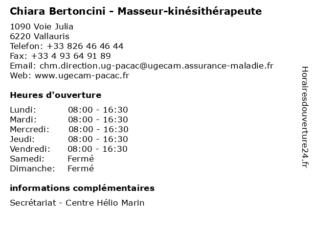 1 Dr Chiara Negri - Chirurgien général (Distance: 7,09 km) 107 Avenue de Nice, 06606 Antibes antibes, centre, chiara, chirurgien, digestif, disgestive, dr, foie, glandes, général, généraliste, hospitalier, juan, les, negri, pins, viscerale 2 Chiara Busi - Masseur-kinésithérapeute - secrétariat (Distance: 22,65 km) 41 Rue de France, 06000 Nice busi, chiara, docteur, kinésithérapeute, masseur, médecin, médecine, secrétariat, secrétariatusi 3 Chiara Shop (Distance: 23,45 km) 8 Rue de la Boucherie, 06300 Nice chaussures, chiara, mode, shop, sport 4 Chiara Broussard - Diététicienne (Distance: 25,08 km) 13 Boulevard de l'Armée des Alpes, 06300 Nice aliment, broussard, chiara, dieticien, diététicienne, medecin, nutrition 5 Dr Bruno Chiara - Neurologue (Distance: 25,63 km) 30 Avenue de la Voie Romaine, 06001 Nice bruno, chiara, consultation, docteur, dr, med, médecin, médecine, neurologue, traitement 6 |