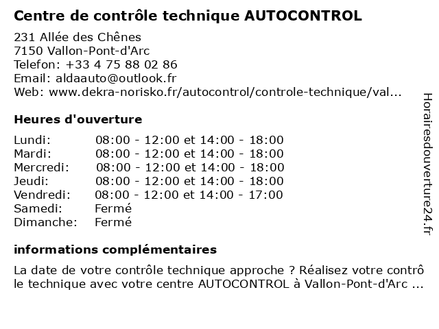 1 Sécuritest Centre Contrôle Technique Auto Sélières Affilié (Distance: 6,03 km) 40 Route de Pradons, 07120 Ruoms affilié, auto, centre, contrôle, sécuritest, sélières, technique 2 Centre contrôle technique DEKRA (Distance: 11,39 km) 65 A Vernades, 07260 Rosières 4x4, camping car, centre, collection, contrôle, dekra, diesel, electrique, essence, gazole, hybride, suv, technique, utilitaire, voiture 3 AS Autosécurité Contrôle Technique JOYEUSE (Distance: 12,29 km) 130 Chemin Des Beaumes, 07260 JOYEUSE as, autosécurité, contrôle, joyeuse, technique 4 E.T.T.B Entreprise Traitement Technique des Bois (Distance: 14,57 km) 41 Les Bras, 07200 Lanas bois, des, e.t.t.b, entreprise, technique, traitement 5 ATBR Atelier Technique du Bois Reboul (Distance: 15,11 km) 130 Le Nogier, 07230 Lablachère atbr, atelier, bois, du, reboul, technique 6 L'Espace Naturel (Distance: 10,61 km) - Le Village, 07120 Balazuc balazuc, espace nature, l'espace, naturel, naturelles, pierres, précieuse, semi |